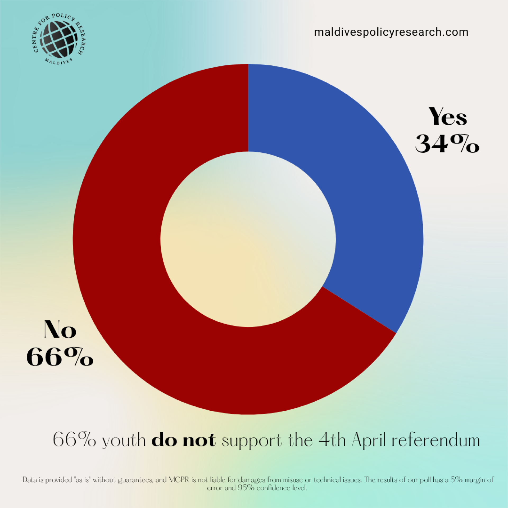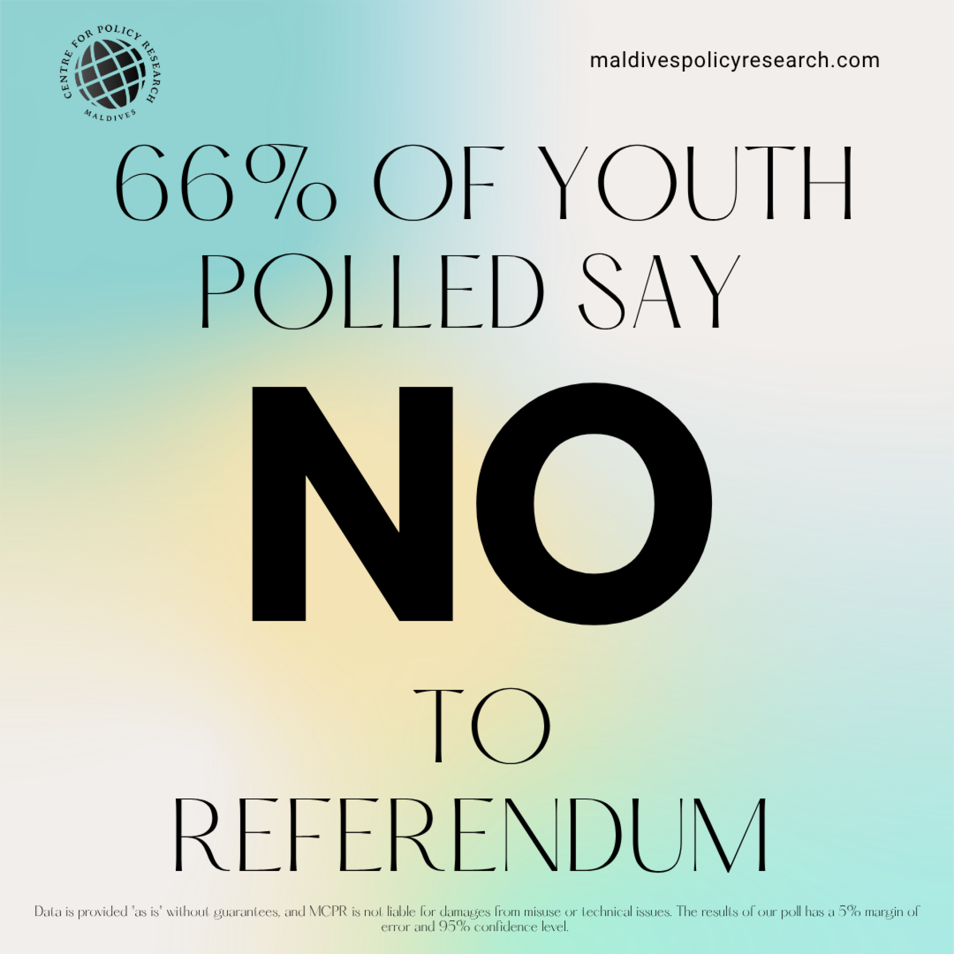The Maldives Centre for Policy Research (MCPR) asked the Maldivian public to share their views on the referendum and the local council elections. Youth voters, in particular, showed high levels of disapproval. This reflects generational differences in attitudes and engagement which may stem from concerns in regard to concentration of power, potential undermining of checks and balances and perceptions that reforms as such could reduce democratic accountability.